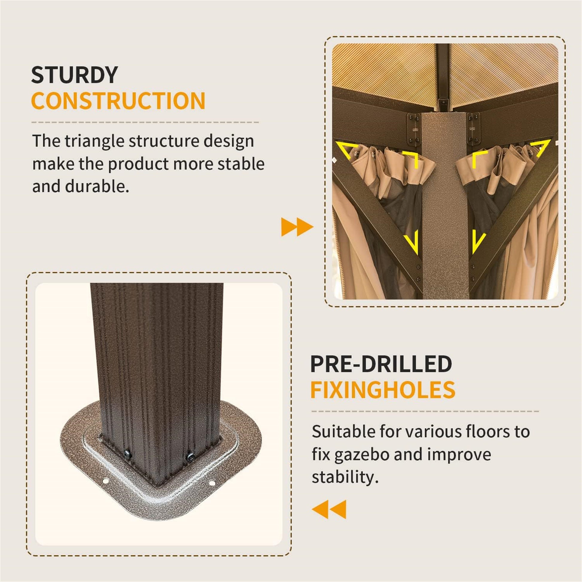 [STURDY ALUMINUM FRAME]The gazebos for patios feature a strong powder-coated dark brown aluminum frame, resistant to fading, rust, and corrosion. Comes with a pre-drilled base for each post. We suggest using expansion screws to make the whole system much more stable.4 corners adopt a triangular stable design reinforced for years of durability and safety.