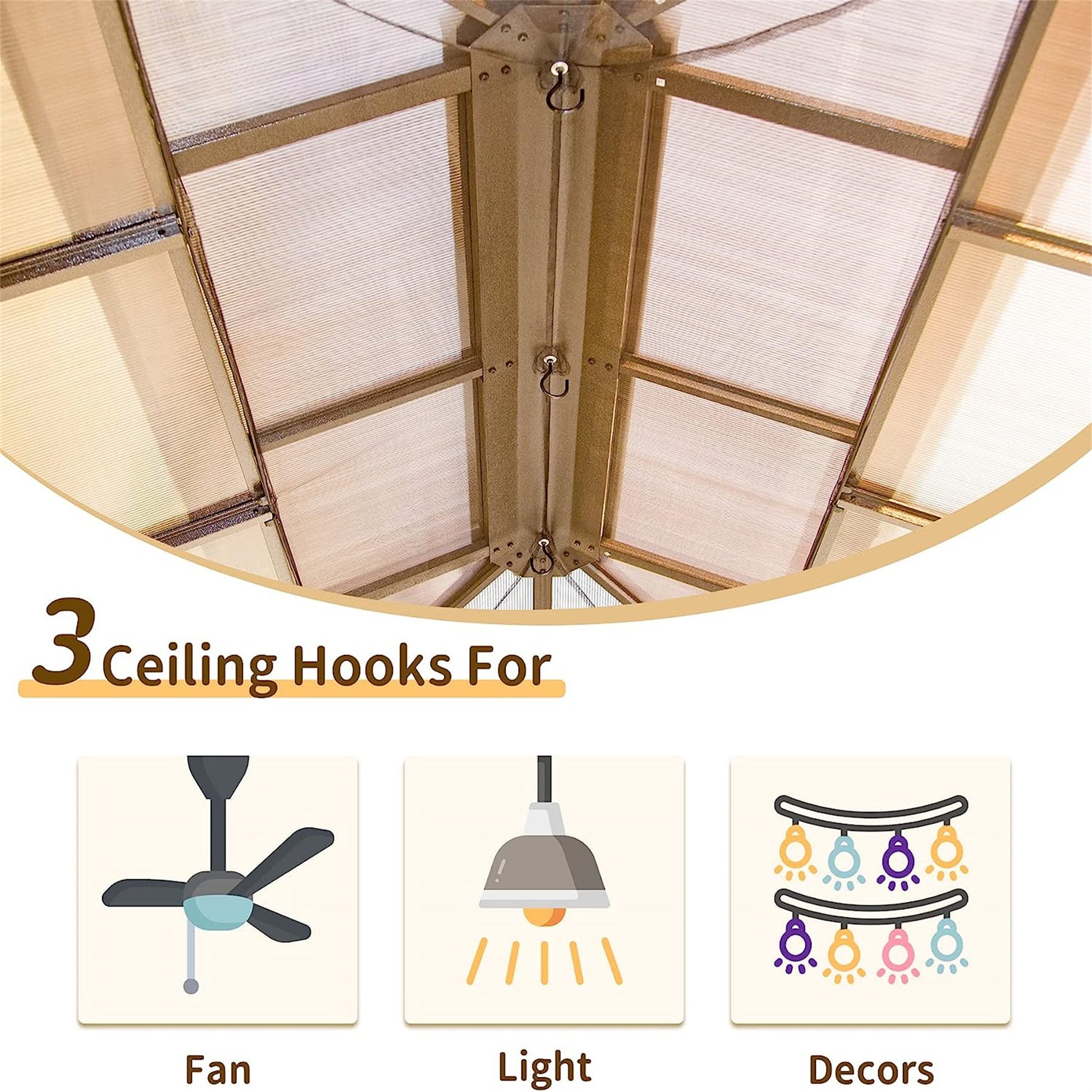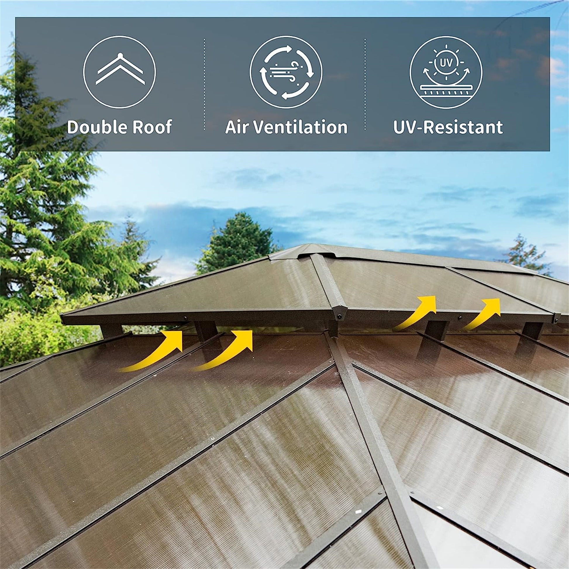 [VENTILATED DOUBLE TOP DESIGN]This outdoor patio gazebo is designed with a ventilated double-layer polycarbonate roof to provide a healthy and airy space. The polycarbonate roof can block 99% harmful UV rays while reducing heat from sunlight.